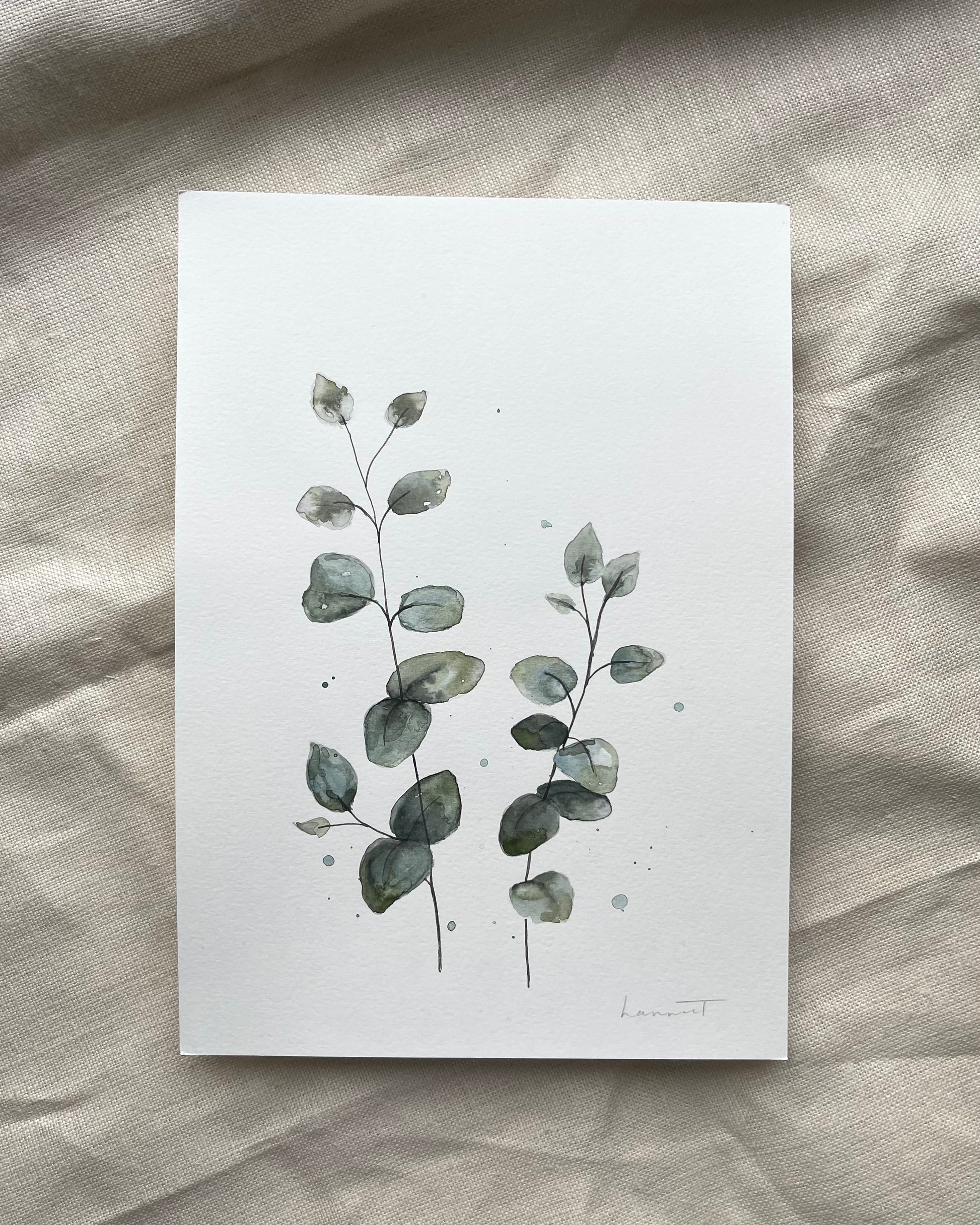 An original watercolour eucalyptus stems painting with leaves in greens and very pale blues. This botanical painting is minimalist style suited for any home or as a gift for someone. The transparency of the watercolour paint captures the sense of calm the dried eucalyptus leaves are known for.