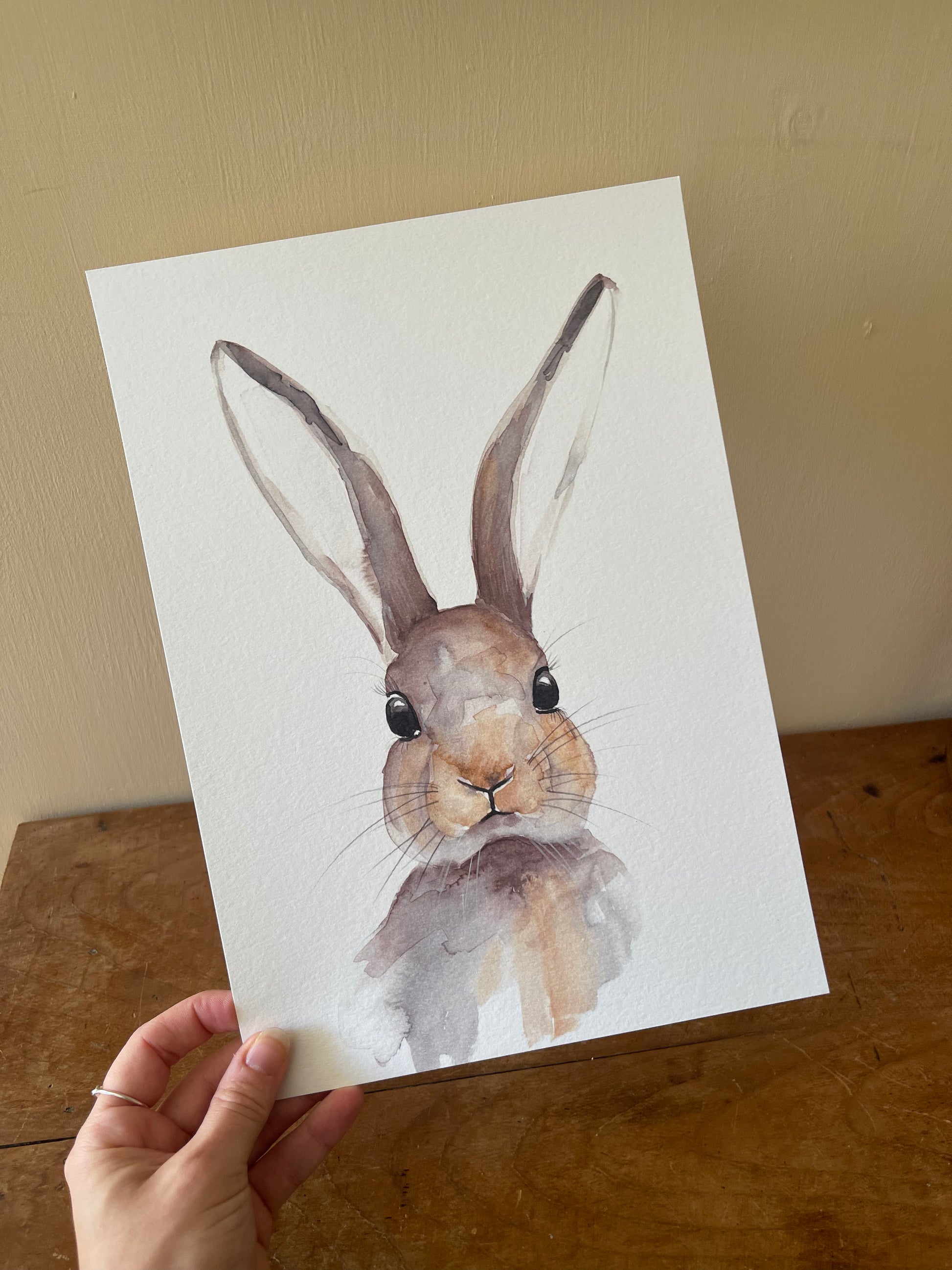 A print of a watercolour painting featuring a bunny rabbit. It would look great as a single piece in a bedroom or anywhere in your home. This artwork would look perfect in a nursery.